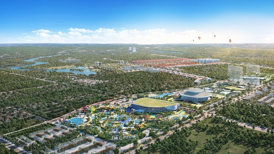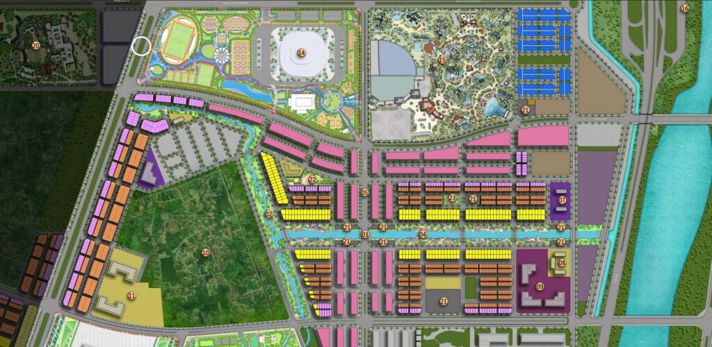 | Phân khu dự kiến | – Khu trung tâm lễ hội & trục cảnh quan – Khu trung tâm thương mại – dịch vụ – Khu biệt thự thượng lưu ven sông |