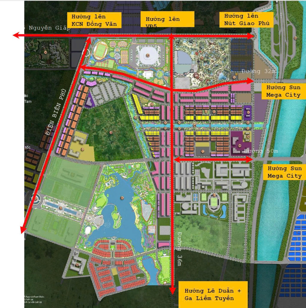 Mặt bằng quy hoạch dự án Bắc Châu Giang – Sun Urban City được kiến tạo trên tổng diện tích khoảng 176ha, theo định hướng trở thành đô thị nghỉ dưỡng – thương mại – dịch vụ đẳng cấp bậc nhất Hà Nam. Dự án chia thành nhiều phân khu chức năng hiện đại: trục lễ hội – trung tâm hành chính mới, khu phố thương mại – dịch vụ sầm uất, và khu biệt thự thượng lưu ven sông. Quy hoạch nổi bật với mật độ xây dựng thấp, hệ sinh thái 4 công viên chủ đề, quảng trường nhạc nước, phố đi bộ cùng mạng lưới giao thông liên hoàn kết nối toàn bộ Sun Mega City. Tất cả tạo nên một Sun Urban City Hà Nam vừa giàu bản sắc văn hóa, vừa đáp ứng nhu cầu an cư – đầu tư, mở ra chuẩn sống đẳng cấp và tiềm năng gia tăng giá trị bền vững